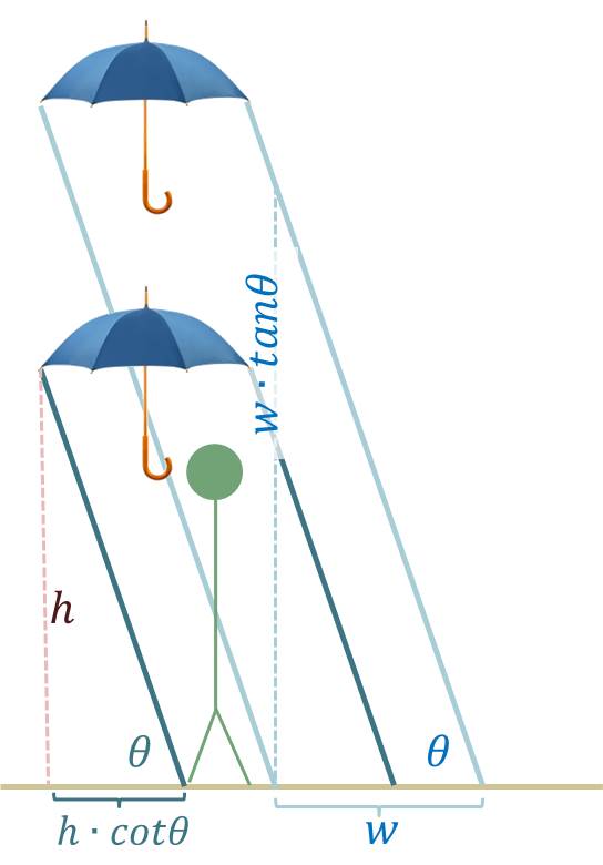 你們看,當雨是斜的,傘的遮蔽範圍將從長方形變成平行四邊形,傘正下方h.cotθ的範圍都會被雨淋濕。傘拿低一點讓h變小,的確有幫助。但更正確的方式,應該是往後退h.cotθ,即可確保褲管不會被淋濕。」
