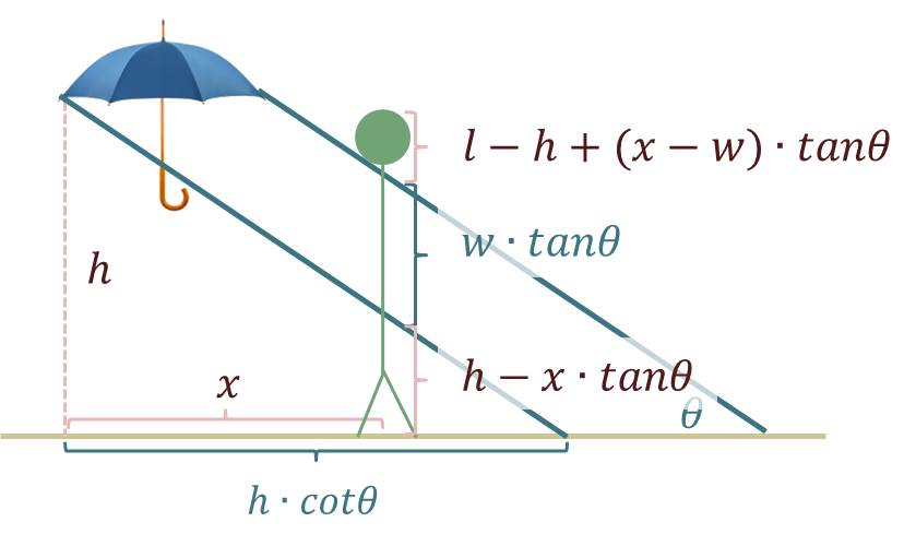 也就是說,褲管直到h-x.tanθ的高度都會濕掉。中間身體w.tanθ的部分不會濕。上半身從天靈蓋往下l-h+(x-w).tanθ的部位都會濕掉。」