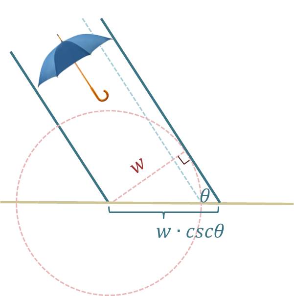 「這是我們在雨中行走的截面圖。假設雨跟地面夾角為θ,拿傘的高度為h,傘的寬w。