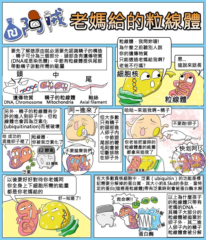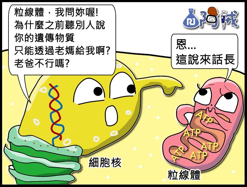 但其實在《新英格蘭醫學期刊》2002年第25期的〈Paternal Inheritance of Mitochondrial DNA〉研究中,也有極少數細胞的粒線體帶有父親的DNA,大家可以去看看,不過也產生不少遺傳性疾病。