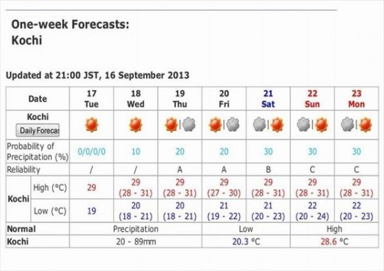 再以亞洲國家為例,日本則運用「統計機率的分級」來呈現氣象預報的真實性,將每一天的預報依照可預測的準確度,也就是統計學中的信心水準,由高至低分為A、B、C三級。譬如在一周當中,估計第三、四天有鋒面系統通過,會因為鋒面通過速度的變化,影響第二、五天的預報結果,因此距離鋒面通過最遠的第一、六、七天分為信心水準最高的A級;第三、四天因為鋒面通過而天氣波動較大,則分為B級;第二、五天剛好在鋒面過境與否的臨界點,不確定性最大,因此分為信心水準最低的C級。