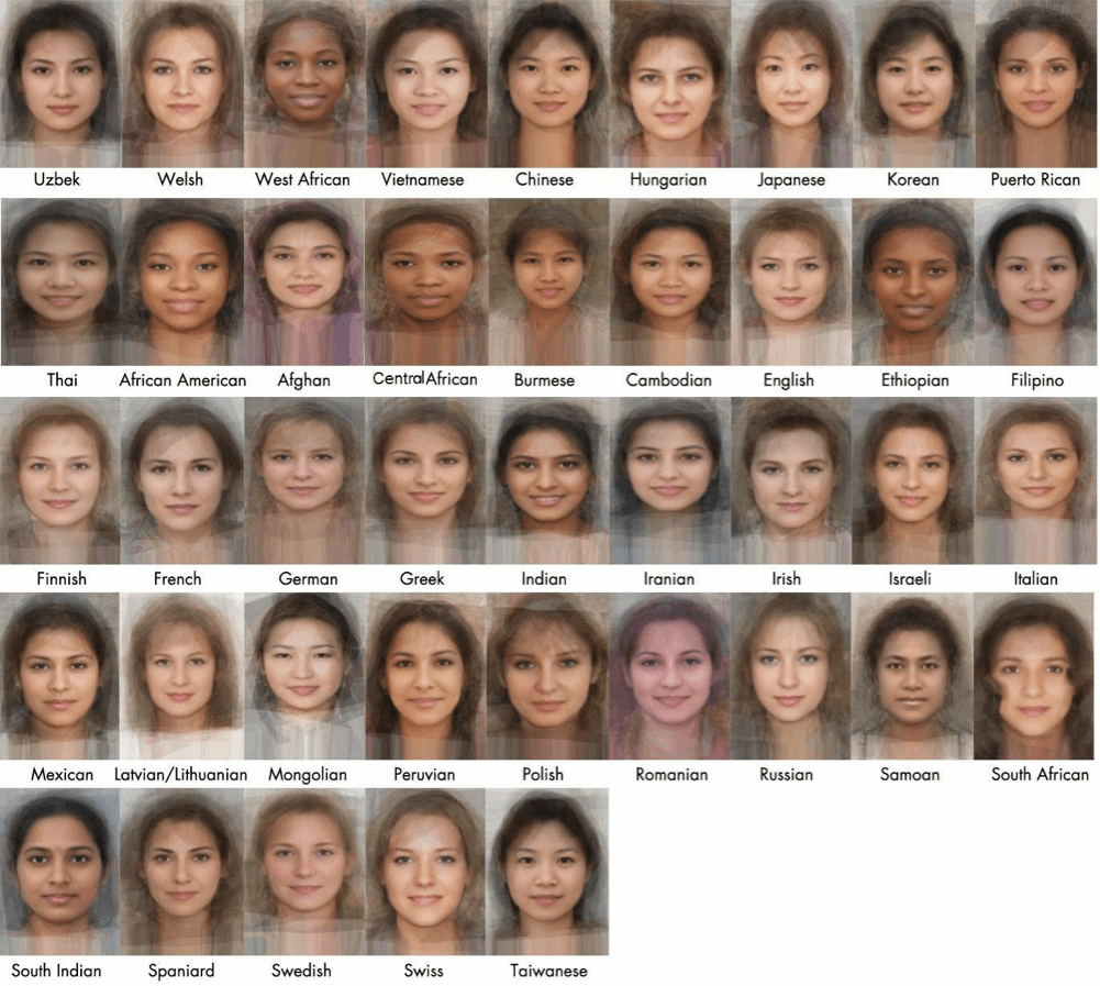 那麼要如何取得世界各國不同的臉型呢? 我們首先假設各國女性的平均臉是各個國家中理想的美女。2013年Collin Spears在他的部落格上蒐集了各國女性的正面照片,並將他們做平均。