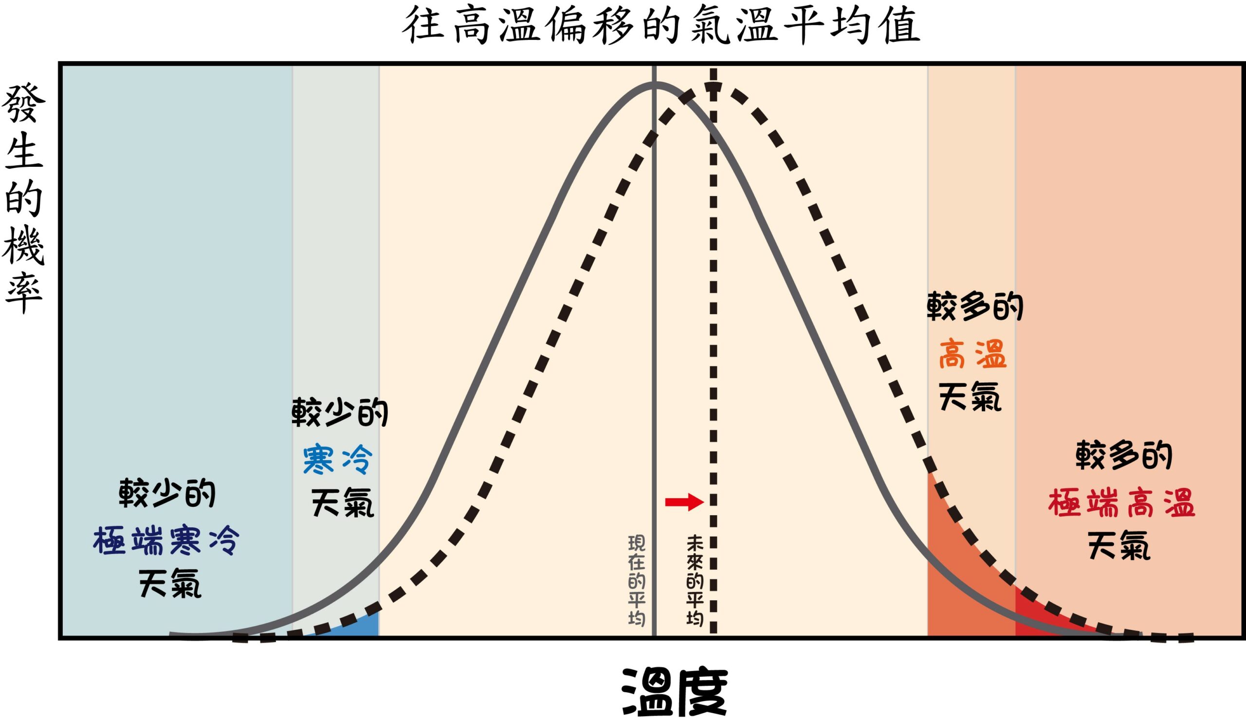 在最單純的情況下,全球暖化造成平均氣溫升高,發生高溫或熱浪等極端天氣的機率因此增加。(圖片來源:作者,改繪自 Special Report on Managing the Risks of Extreme Events and Disasters to Advance Climate Change Adaptation)