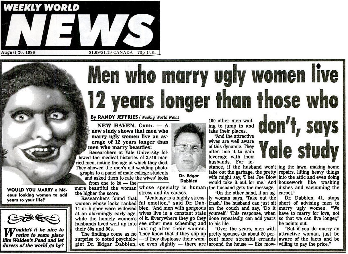 到底耶魯大學的研究人員是怎麼發佈消息的?解剖員追溯新聞報導提到的「耶魯大學研究」,但卻在網路上遍尋不著這項研究,相關的報導僅見於Weekly World News(世界新聞週報,簡稱 WWN)在1999/02/09、1996/08/20分別刊登同一則以「Men who marry ugly women live 12 years longer than those who don’t, says Yale Study」為題的報導(如下圖)。內容提到是耶魯大學的研究,雖然沒有說明是哪個單位的研究?資料出自哪裡?但是參與的受試人員竟也是不偏不倚的「3519」人!解剖員幾乎可以斷定,這篇始於1996年的報導就是這系列新聞的祖師爺,只是這種2014年與1996年之間的超時空對話,雖然讓人覺得疑點重重,但是過程真的是太浪漫了。