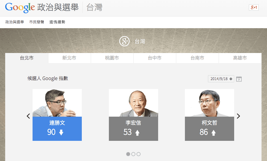 隨著市長選舉的逐漸逼近,許多針對選情建立的網站也紛紛出籠, 其中最亮眼的莫過Google所建立的Google政治與選舉, 不但可以即時對市政提出建議也每日更新競選趨勢,只是這趨勢是用 Google 指數為指標,至於什麼是Google 指數呢?以下是Google上的官方訊息回答。