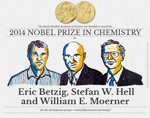 艾瑞克・貝齊格(Eric Betzig),史蒂芬・海爾(Stefan W. Hell)以及威廉・莫納(William E. Moerner)等三人得到了2014年的諾貝爾化學獎,這是因為他們越過了一個科學上設想的限制,也就是光學顯微鏡的解析度永遠無法比 0.2 微米更精確。但如今,利用分子的螢光,科學家現在可以監看在細胞內部分子之間的相互作用;他們可以觀察與疾病相關的蛋白質之聚集,也可以在奈米的尺度裡追蹤細胞分裂。