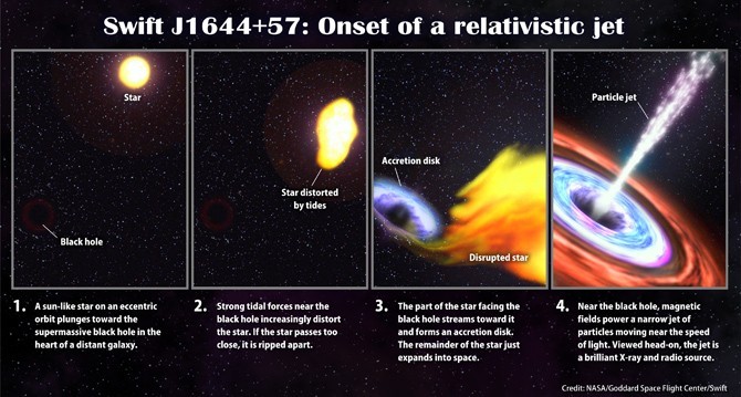 美國航空暨太空總署的「雨燕」衛星 (Swift) 於2011年3月28日偵測到天龍座方向發出前所未有的異常高能閃焰。此閃焰來自38億光年外的一個星系,顯示星系中心的黑洞正吞噬一顆類似太陽的恆星,稱為「Swift J1644+57」,以衛星名稱以及坐標位置來命名。