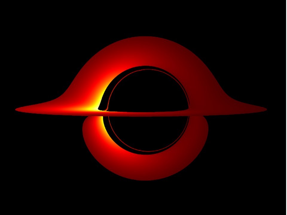 圖三:黑洞剪影的另一個例子,由四面八方掉入黑洞的發光物質所發出的光,被位在中央的旋轉黑洞彎曲後所形成的影像。(圖片來源:作者)