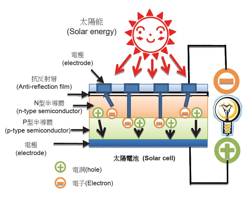 太陽能板分成3層,第一層是抗反射層(Antireflection),這層是為了要增加光的吸收量,可以增加整體的效率。做成鋸齒讓本來只能針對特定波長反射率,變成可讓所有波長的反射率都降低,讓光能更有效地被吸收。也透過表面的微細結構,產生荷葉效應讓太陽能板上的髒污可以被水吸附帶走。中間的是p-n接面層(p-n Junction Layer),也是最重要的一層,有n型半導體跟p型半導體,電子會往n極半導體移動,產生正負差。最後一層是電極層(Electrode Layer),分為上電擊和下電擊。