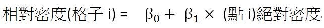 公式中的i代表某一點所在的格子,B0和B1是截距和斜率,透過已知的樣本可以找到這兩個係數,如此一來,其他未知絕對密度的格子,就可以套用這個關係式求得絕對密度了。