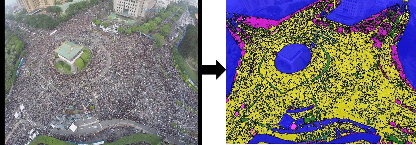 網友的平面照片可以取代監視器畫面,只要有人在的地方,就有機會取得那個地方的影像,比監視器遍布的範圍更廣,資料的共享性也更高,這份研究挑選了其中下午4點左右的照片,避免人口分布隨時間變化的問題。此外,我們還是會遇到影像不連續的問題,也就是說,照片再多,也不可能100%遍布所有地區,因此我們需要4點時大範圍的空照圖,來處理這個問題。