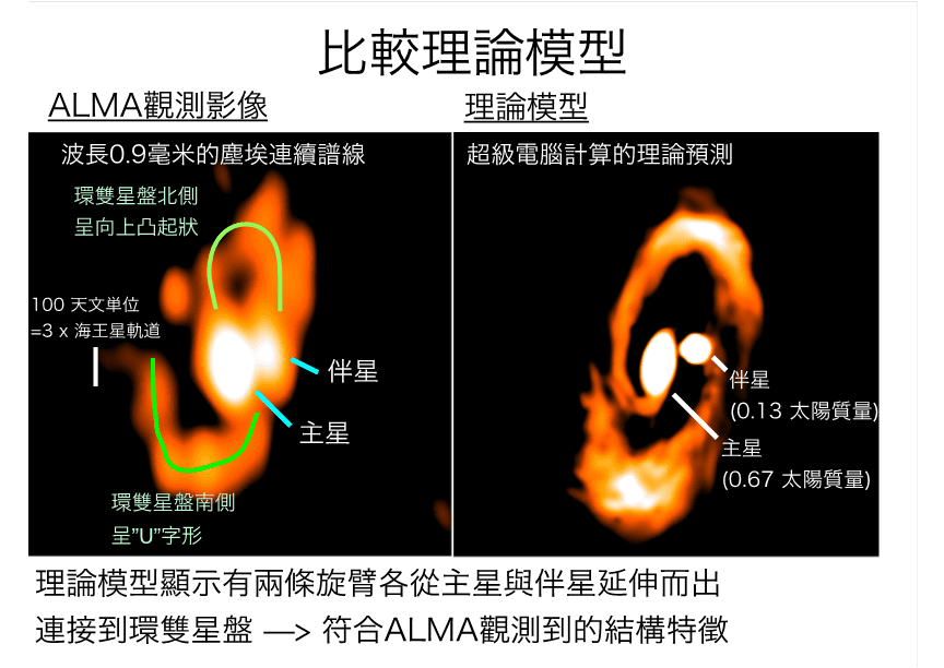 不說你一定不知道,今年11月20日,在天文物理學報上刊登了台灣研究團隊的報告,由中研院天文所的高桑繁久博士領導的國際團隊,利用ALMA拍攝到人類史上最清晰的雙星形成照片。照片裡面清楚地顯示:一個主星和一個伴星正在同時形成,主星和伴星相距大約是一個太陽系的距離。伴隨著兩條環星的旋臂,有如臍帶一般,將物質源源不斷地送進這個雙星系統,幫助他們長大。根據先前研究,這一個雙星系統相當年輕,差不多相當於懷孕兩個月的胚胎咧!重點是,這一張照片,完全可以利用理論模式重現,換句話說,只要調整電腦模擬的時間軸,天文學家就可以「預測」這個雙星系統的未來!