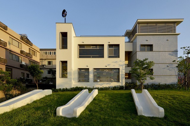 以中壢市立幼兒園高鐵分班為例,建築配置上安排樓梯、廁所等服務核集中於西曬面,東側設置陽台,南側設有遮陽板避免熱能大量溢入建築體中,北面則可大量開窗。「天氣好的時候,甚至不必開燈。」盧建築師表示。沒有綠建築標章的建築就不能稱為綠建築嗎?他挑戰了這個既有觀念,認為綠建築標章是一種具象化並推廣理念的方法,綠建築中的很多概念,是可以打散而滲入每棟建築設計之中的。