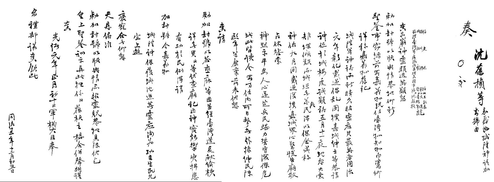 研究歷史地震,各地方稟報災情的奏摺是很重要的參考文獻,圖為1862年台南大地震沈葆禎奏報嘉義縣城隍神的文件。(圖片來源:臺灣地區歷史地震資料庫)