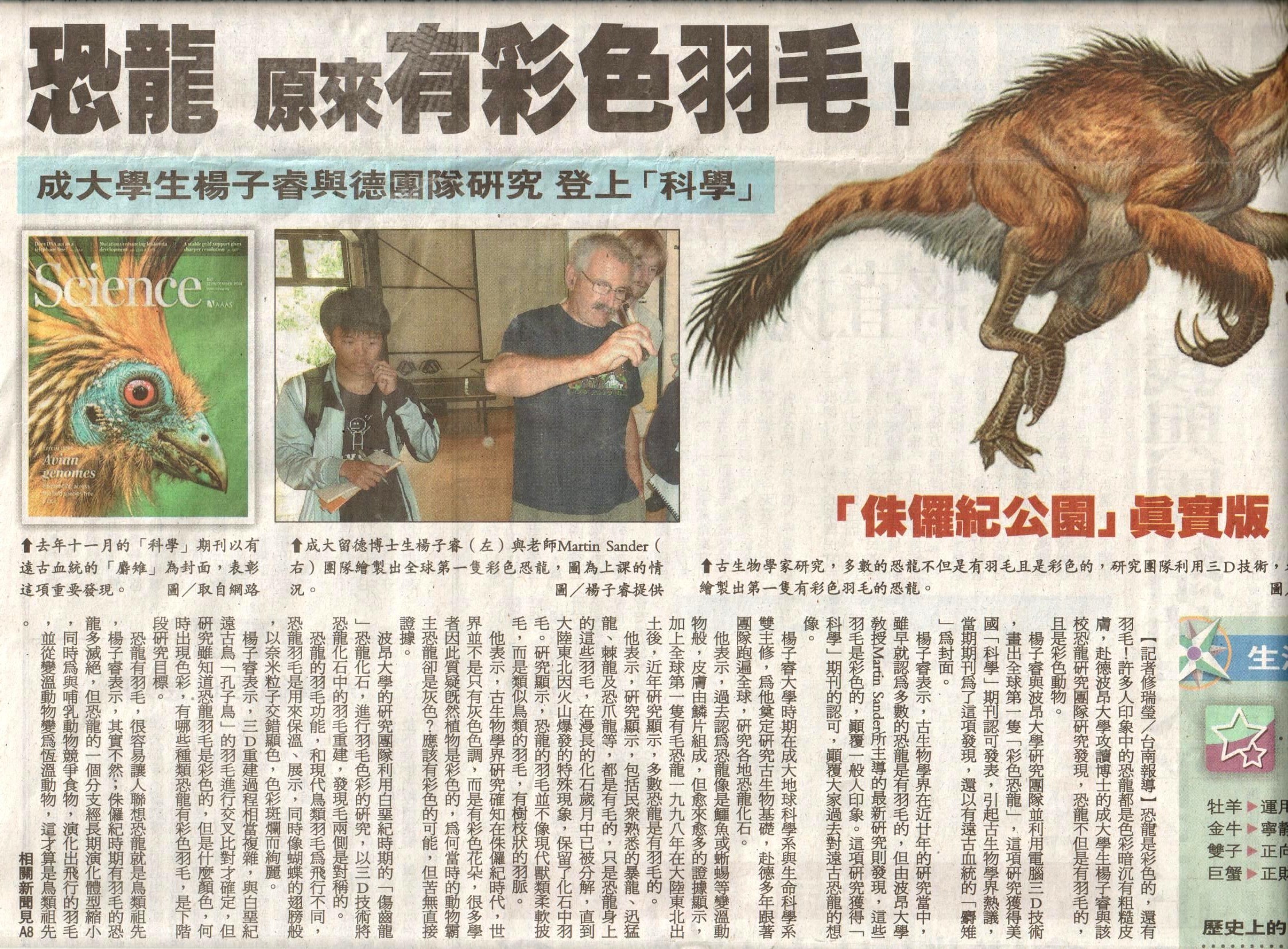 2015年3月2日,相信那天一大早看報紙的人一定會驚呼頭版上一則難得的本土科學新聞:「恐龍 原來有彩色羽毛!」內文中提及,赴德波昂大學攻讀博士的成大學生與該校恐龍研究團隊研究發現,恐龍不但是有羽毛的,且是彩色動物,相關的研究結果更登上美國《科學》期刊(Science)。看到這裡,連解剖員也忍不住讚嘆,沒有三兩三可不容易登上「科學」啊,想像著色彩斑斕的恐龍畫面,這不叫台灣之光什麼才叫台灣之光?!