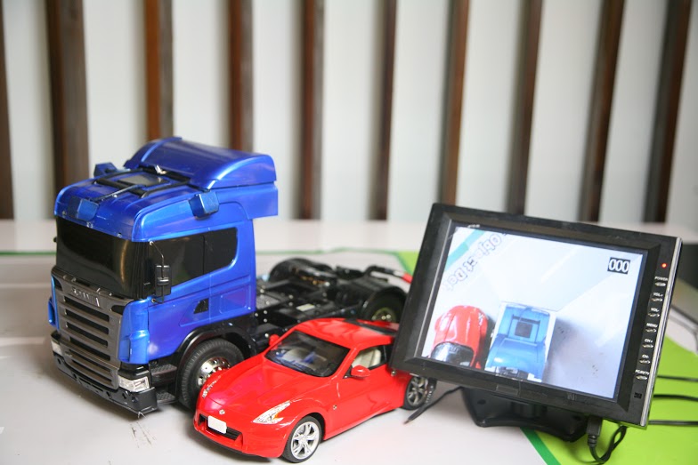 盲點警示系統在模型卡車上的展示,紅車靠近卡車後,螢幕的左方畫面會發出警示