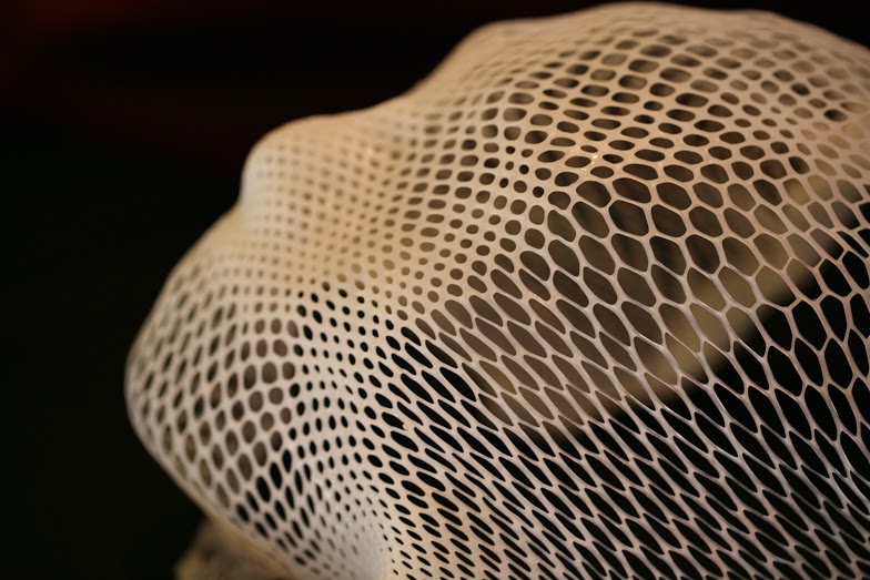 模具特寫。可以看到因為材料具有高延展性,所以原本均勻大小的洞即使拉扯之後,也不會斷裂。