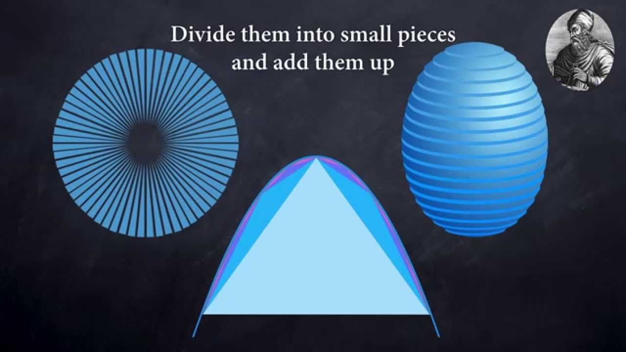 我想繼續談一談窮盡法。這個方法的想法,就是想辦法用無窮無盡的逼近,去得到確切的量度,就像我們在前面用無窮多個正多邊形去度量圓形那樣。這是目前為止發明的度量技巧當中,最強大且最靈活的方法。原因在於,這個方法把曲線形狀的量度,簡化為直線形狀的量度。想不到我們竟能精確度量彎曲的形狀,而且還能度量得如此深入而漂亮。