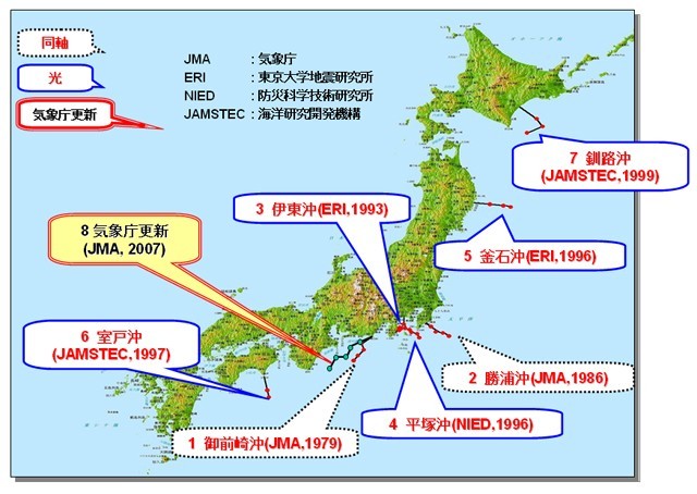 接著再來看一下日本的做法,以下是截至2008年以前日本鋪設的海纜地震儀: