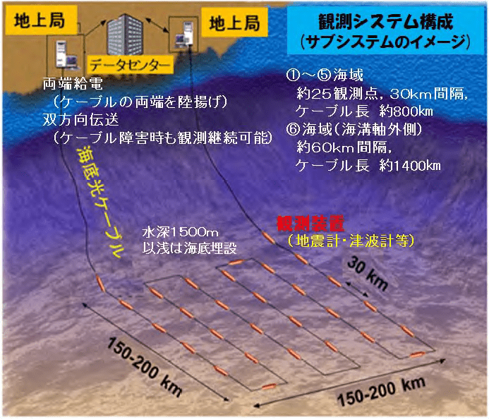 附帶一提,2011年311地震之後,日本深覺自己對東北海域的地震太不重視(之前也只有一條海纜),因此又打算鋪設新的串接式海纜地震觀測網,觀測範圍約200×200 km,共有25個地震儀的陣列: