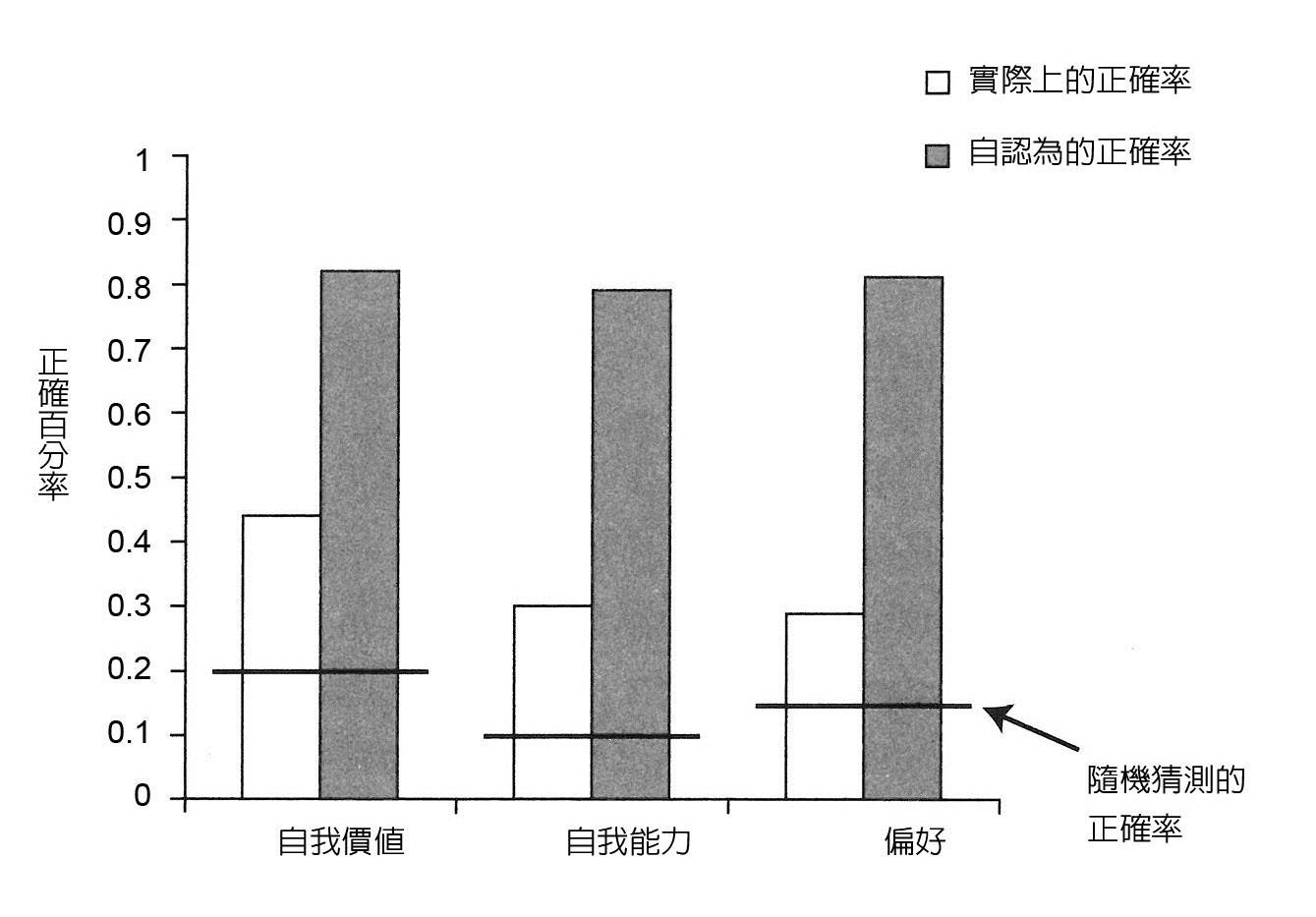 要看出這兩種結果,你可以想像和愛人共同參與一場有如《新婚夫妻大挑戰》那種節目的實驗。你們兩人分別坐在不同的房間裡,實驗人員向你告知你的愛人絕對不會看到你的答案,然後向你提出一長串有關你自己的問題。其中有些問題涉及自我價值,要求你針對若干陳述指出你有多麼同意或者不同意,例如:「我往往會貶低自己」或「我對自己很滿意」。另外有些問題則是要評估自己的能力與特質:你認為自己的智力、體能、社交技巧等能力與別人相比孰優孰劣。最後還有一些問題與偏好有關,尤其是你對二十四種不同活動的喜好或厭惡程度(例如打牌、游泳、拜訪朋友以及洗衣服)。在另一個房間裡,你的愛人則要預測你會怎麼回答這些問題,並且指出自己對於每項預測的準確度懷有多少自信—從百分之零到百分之百。