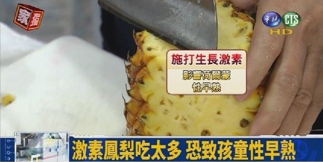 今年因氣候乾旱,鳳梨甜度沒話說,解剖員正好住在以鳳梨聞名的鄉鎮,常常吃鳳梨是很合理的事情(大口咬);但是,就在4/13日看到華視一則以「激素催熟鳳梨 吃多恐性早熟」為標題的電視新聞,螢幕的左上角還有「獨家」報導的字樣旋轉著,新聞中指出: