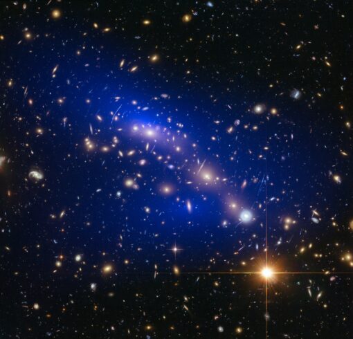 This is a NASA/ESA Hubble Space Telescope image of the galaxy cluster MACS J0416.1–2403. Shown in blue on the image is a map of the dark matter found within the cluster. This cluster was part of a study of 72 galaxy cluster collisions which determined that dark matter interacts with other dark matter even less than previously thought.