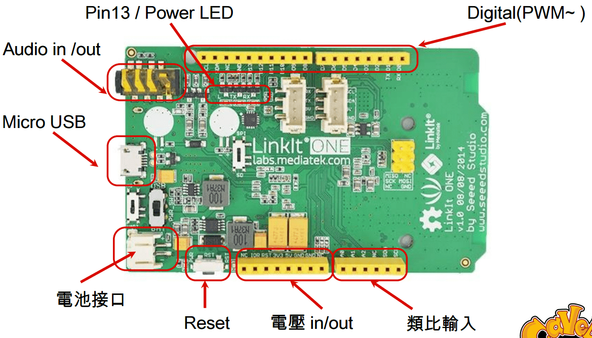 在LiniIt ONE 正面,由左側開始順時鐘依序是micro USB 接口、聲音輸入輸出接孔、指示LED、數位腳位、類比輸入腳位、電源腳位、Reset重置按鈕與電池接孔。只要將microUSB 傳輸線接上電腦的USB 埠或是接上電池,LinkIt ONE 就會啟動並執行其中的程式(圖3)。