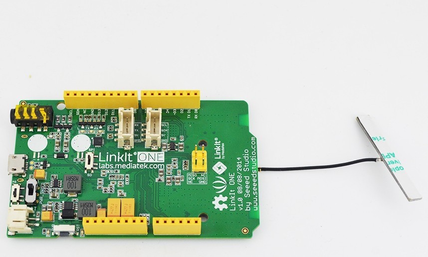 LinkIt ONE 的聯網功能共有Wi-Fi、GPRS 行動網路、藍牙與GPS 等。本篇先從由Wi-Fi 取得指定網頁字元開始。LinkIt ONE 的Wi-Fi 是基於MT5931 這顆晶片,加上盒裝內附的天線會有比較好的通訊效果(不安裝也可以)。另ㄧ 方面,Wi-Fi 會有認證問題,請勿使用像是學校這類型的兩階段認證系統。或者如果您的手機門號是無限上網的話,也可以使用您的手機做為LinkIt ONE 的專屬網路熱點。準備硬體時, 請將Wi-Fi / 藍牙天線( 圖1) 接到 LinkIt ONE 背面的Wi-Fi 接點。雖然晶片是整合在板子上,所以未連接也可以進行通訊,但連接後可以得到比較好的通訊效果。板子上有標示天線要接在哪,在這裡請注意別接錯了(圖2)。