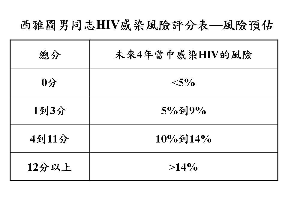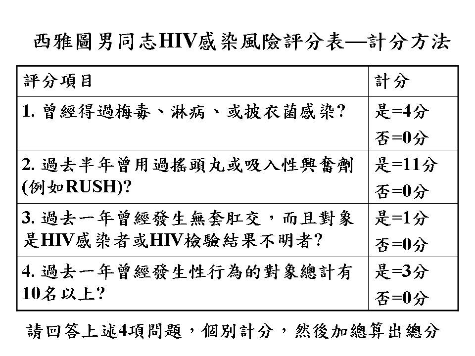 西雅圖的華盛頓大學團隊,針對1900多名男性間性行為者,進行長達近7年的追蹤,發現有101位感染HIV。他們就這些研究對象的行為風險因子進行分析,在2009年設計出一套評分表,提供給照顧男同志的醫護人員,用來評估HIV感染風險。如果你本身是男同志,也可以試著用這份評分表算自己感染HIV的風險。