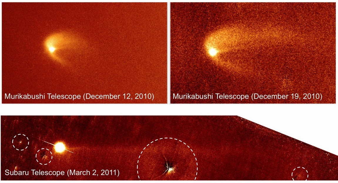 由韓國首爾大學(Seoul National University)、日本國立天文台(National Astronomical Observatory of Japan,NOAJ)、日本太空航空科學研究所(Institute of Space and Astronautical Science,ISAS)和日本神戶大學(Kobe University)等機構的行星科學家和天文學家,找出可以解釋第596號小行星Scheila擁有3條塵埃尾(dust tails)如此特殊現象的原因。他們認為在2010年12月3日時,應有另一顆直徑約20-50公尺的小行星,從背對地球的Scheila後方撞擊,才會讓當時的Scheila突然異常增亮,並形成3條奇怪的塵埃尾;而此現象也讓Scheila成為數量極少的主帶彗星之一。(此新聞所用時間日期均為國際標準時,UT)