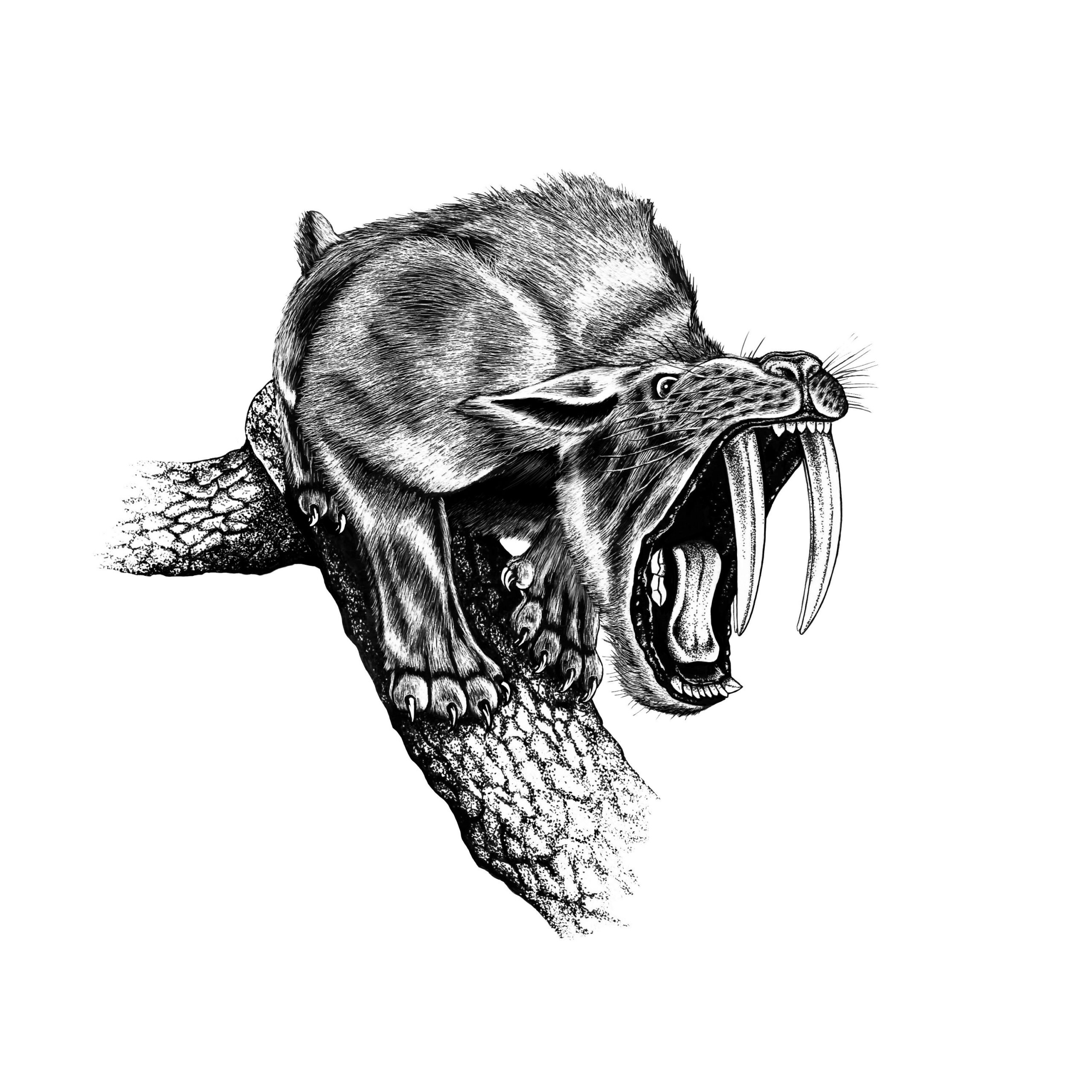 隨著牙齒的尺寸發展到極致,劍齒虎能夠撲殺的獵物也越來越大。在那個充滿雷獸、巨型樹懶和乳齒象的時代,確實是一大優勢。在整個哺乳動物譜系中,至少有四群動物演化出劍齒,前兩個分屬現已滅絕的掠食性動物,肉齒目動物(creodonts)如擬貓獸(Apataelurus sp.)和獵貓科(nimrarids),如弗氏巴博劍齒虎(Barbourofelis fricki),還有貓科動物,例如彎齒貓和短劍齒貓,最後則是有袋類動物的袋劍齒虎(Thylacosmilus atrox)。我們多半都將現存的有袋動物與澳洲聯想在一起,但有袋哺乳動物其實曾分布在世界上絕大多數的地方,而有袋劍齒虎則是分布在南美洲。