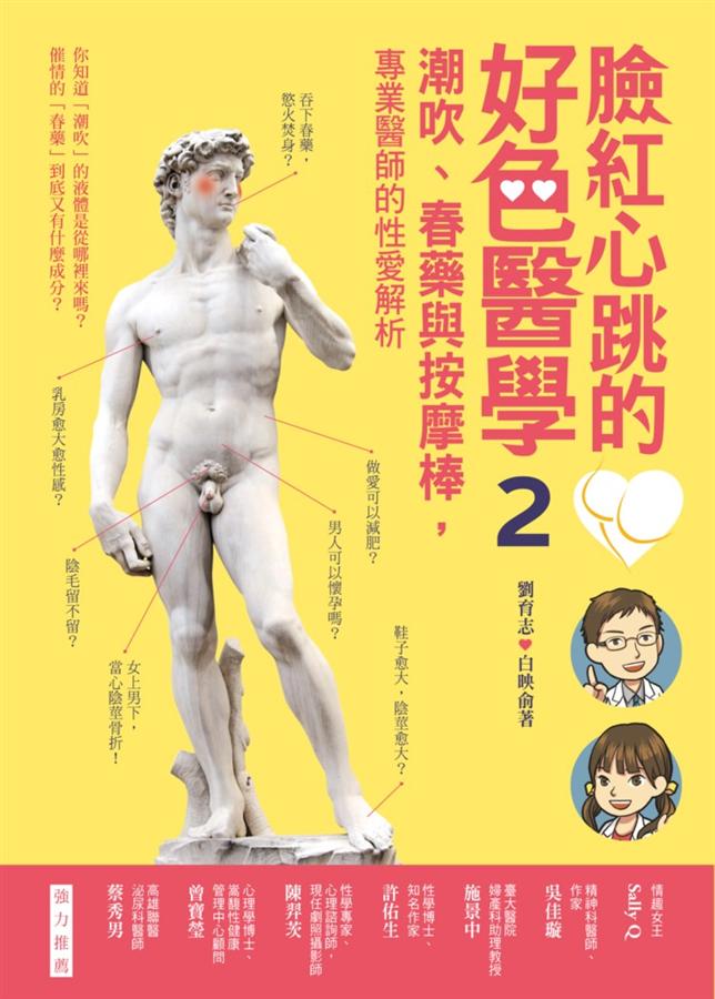 為了解答眾多朋友很想問又不知該不該問的問題,小志志與白映俞這對醫師夫婦,繼 2014 年推出《臉紅心跳的好色醫學:從 G 點、隆乳、自慰到同性戀,醫生這樣談性》,他們再接再厲為大家的性福加油,再度推出《臉紅心跳的好色醫學 2:潮吹、春藥與按摩棒,專業醫師的性愛解析》,小志志與白映俞翻遍醫療研究、古代典籍、民間傳說,專業地從醫學角度剖析那些令人好奇誤解、又不敢公然啟齒的羞羞疑問。讀了《臉紅心跳的好色醫學 2》才知道,我們還真甭羞羞啊,我們的老祖宗不分中外,都為了性愛所作過各種可歌可泣的努力(請參見〈你不可不知的好色醫學〉)。