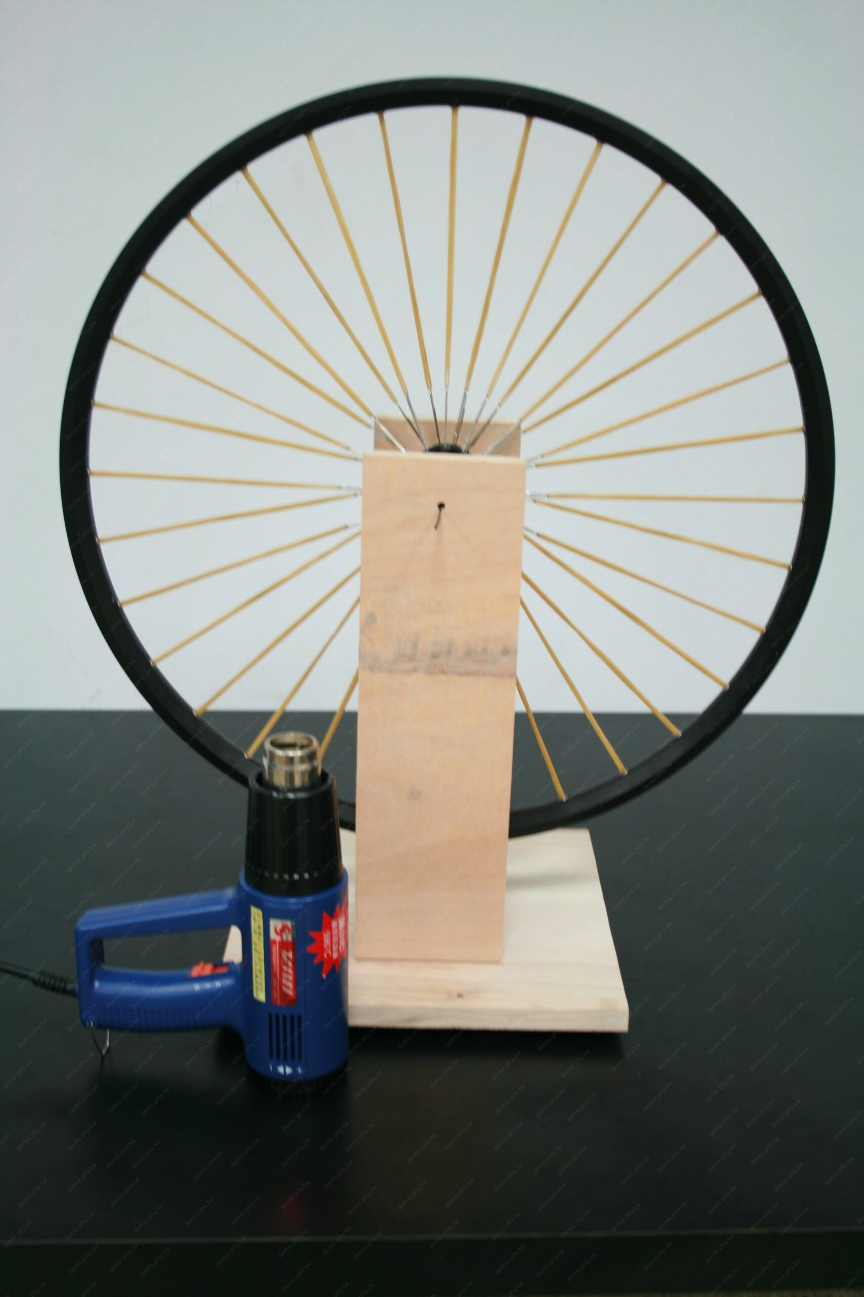 一般的橡皮筋是由糾結的高分子所組成的,當加熱時候因為各個分子段可以動的方式更多,所以就像纏的越複雜的線會越小一樣,加溫的高分子橡皮會因為纏的越複雜而收縮拉緊(與一般的熱漲冷縮不同)。影片中的燈可以幫橡皮筋加熱,加熱後的橡皮筋因為收縮所以把那部份的邊緣往中間拉一點,這樣一來重心的位置就向沒有加熱的那邊偏移,一旦重心偏移發生,整體就受到一個力矩開始轉動。