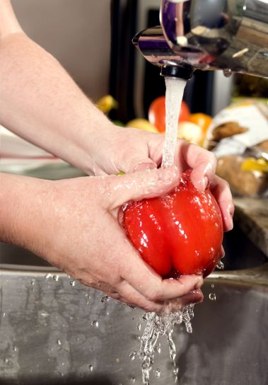 豆菜、彩椒、茄類、瓜果,這些表面有凹陷、帶蒂頭的蔬菜等,利用浸泡方式,讓殘留在凹陷部分的農藥分解在水中,清水沖洗過後,以軟毛刷輕刷去殘留在表皮的農藥,再切除蒂頭。彩椒類可直接切除頂端及底部凹陷的部位,避開這些容易造成殘留的部位。