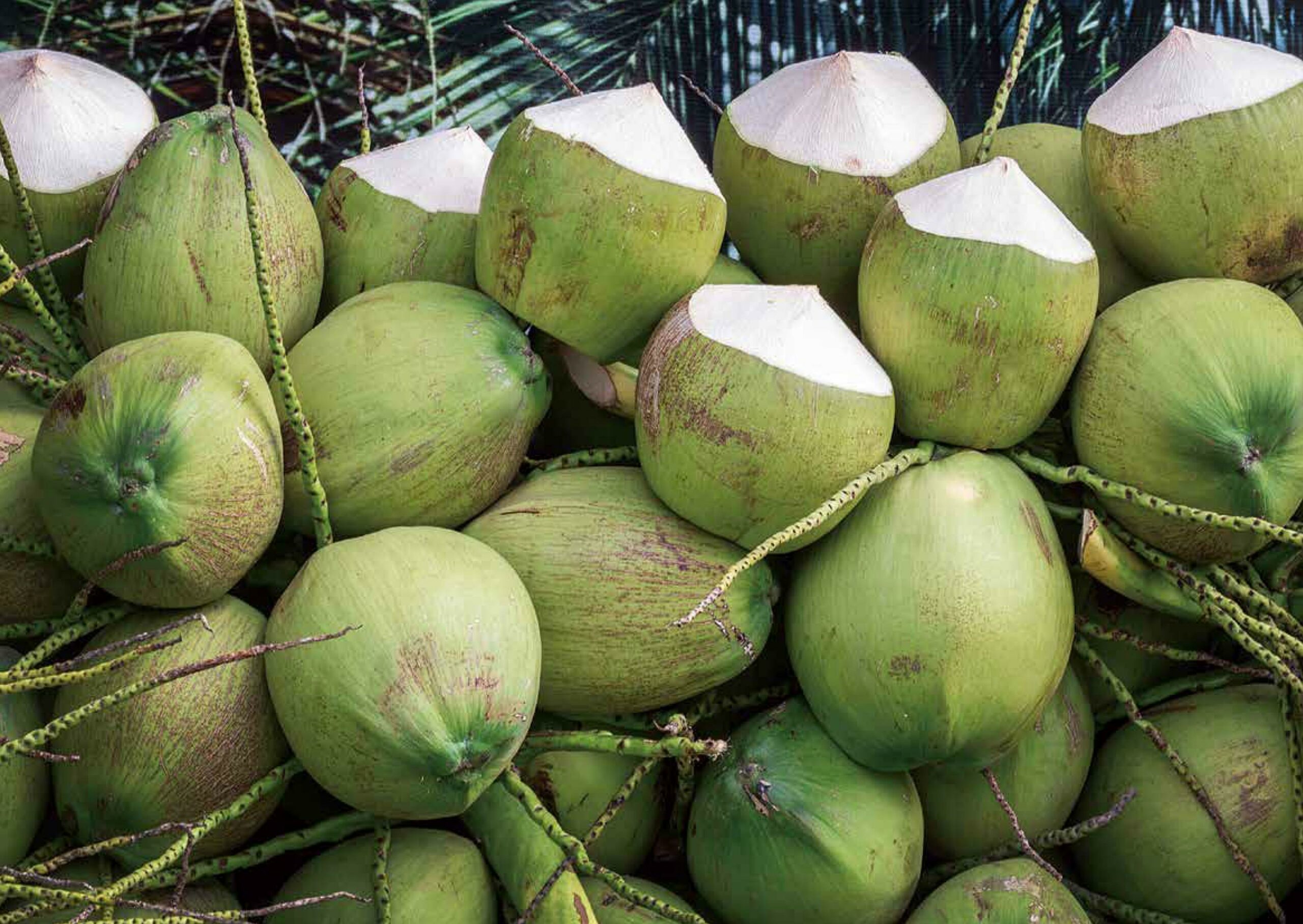 在熱帶旅遊城市的大街小巷,常能見到叫賣新鮮椰子的商店或攤販。這些椰子大都從樹上採摘下來不久,飽滿、光滑、青綠泛黃。烈日炎炎,口乾舌燥,這時若來一個椰子,喝上幾口鮮甜清爽的椰汁,該是何等幸福!要是當場取飲椰汁則更有趣:水果攤老闆會俐落地拿起大刀劈開一層厚厚的果殼。從橫切面上看,果殼外圍綠色部分最薄,為外果皮;往內是纖維質的中果皮,俗稱椰棕,這部分最厚。用力剝下中、外果皮,便露出帶有三個洞、乾燥堅硬的內果皮。