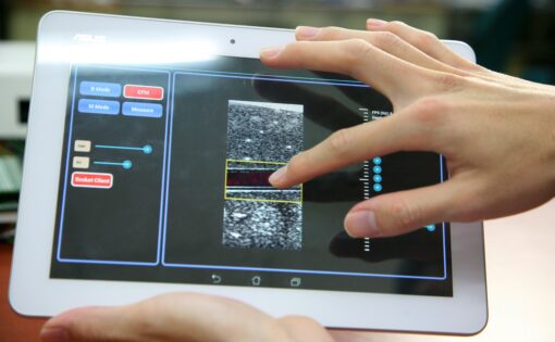 提到超音波,腦海中率先浮現的印象大概是醫院的婦產科裡,醫生為孕婦產檢的畫面:醫生拿著「探頭(transducer)」貼在孕婦腹部,身旁一台PC般笨重的機器螢幕上即時顯示出扇形的黑白畫面。工研院生醫與醫材研究所試圖開啟不同的想像,團隊開發出體積如蛋捲禮盒大小的輕便超音波設備,團隊也設計友善介面,探頭與顯像裝置可無線傳輸,直接以平板或手機作為顯像裝置,解讀超音波影像。