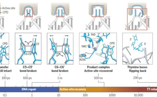 中研院蔡明道團隊運用 XFEL 技術,以原子解析度拍攝酵素修復紫外線 DNA 損傷的過程,揭示從電子轉移到雙股黏合的細節,為酵素學與藥物研發開啟嶄新可能。