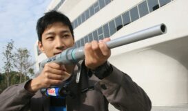 首先先安裝打氣筒到L彎頭,這時候可以先試著裝看看,如果打氣筒太大無法安裝,有兩種方法可以解決:使用砂紙研磨讓打氣筒變小;另一個方法就是用火烤或是水煮把水管加熱,使它變軟。再來就是使勁將打氣筒塞入L管。