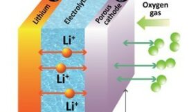 一如其名所暗示的,鋰空氣電池利用空氣來運作,拉出氧分子以用於多孔、碳基的陰極,而陽極則用鋰。因為用的是空氣,意味這種電池不需要在陰極存放沈重的電荷源,所以該電池能提供極高的能量密度,幾乎與相同體積汽油所能提供的能量相當,是鋰離子電池的 5-10 倍以上。