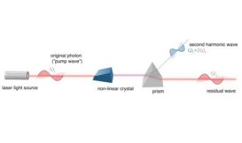 美國科學家研發出一種能將紅光轉變為藍光的新材料,此倍頻(frequency doubling)技術又稱為二次諧波產生(second harmonic generation, SHG),是利用名為奈米杯(nanocup)的特殊三維電漿子奈米結構來達成。