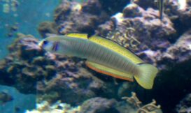 斑馬鰭塘鱧(Ptereleotris zebra),又名斑馬凹尾塘鱧,身體修長,喜歡在珊瑚礁附近懸浮,看似悠閒實則是緊張大師,老是神經兮兮,稍有風吹水動,就如飛鏢般直衝入最近的岩石縫隙中躲藏,非等到海不揚波,才會再次出來活動,因此西方人戲稱牠為飛鏢魚(dartfish)。除了躲藏速度如飛鏢般快外,斑馬鰭塘鱧體型修長,張鯺時與西方人在酒吧中玩的飛鏢盡也有幾分相似,加上準確且迅速”命中”靶心(隙縫)的功夫,取此封號當之無愧。