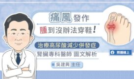 痛風症狀又急又猛,但它其實是種慢性病,因為體內尿酸濃度過高,逐漸在關節或周圍組織形成結晶,而使關節出現發炎反應,患者平時就要注意飲食或服用藥物控制,以免器官損傷、關節變形。